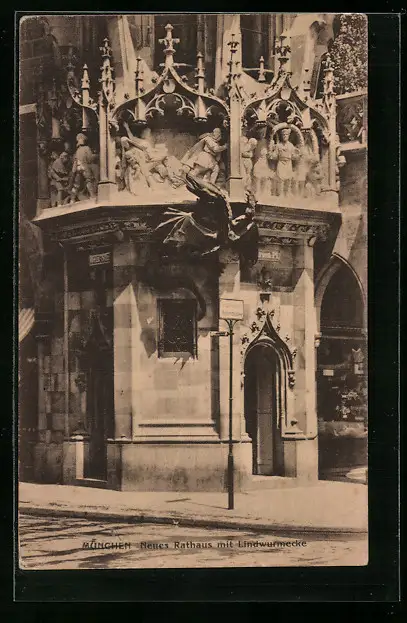 AK München, Neues Rathaus mit Lindwurmecke