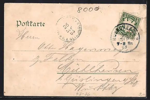 gelaufen 1903, Eckknick unten li., guter Zustand