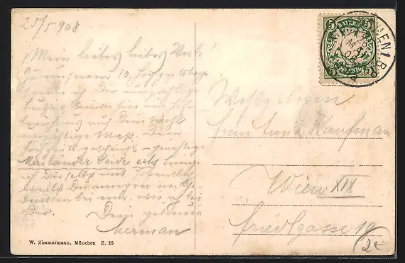alte Ansichtskarte, gelaufen 1908, rückseitig Oberflächenschaden, guter Zustand