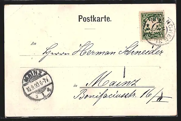 alte Ansichtskarte, gelaufen 1900, Eckknicke li. unten u. re. oben, minimale Einrisse li. oben u. unten, guter Zustand