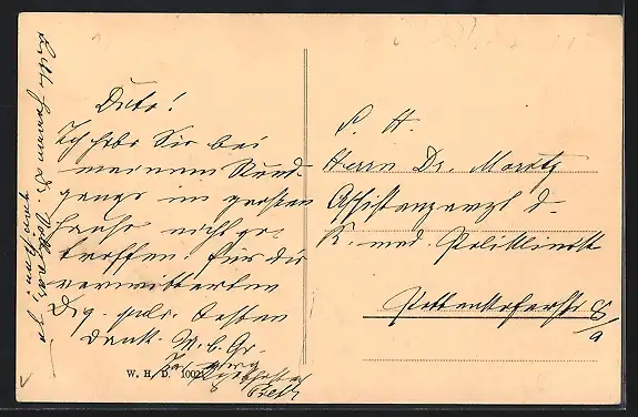 Personenbezogene Daten auf der Rückseite der Karte wurden durch blauen Textmarker unkenntlich gemacht. Die blauen Stellen sind auf die Vorderseite durchgeweicht und wirken sich negativ auf das Postkartenfoto aus