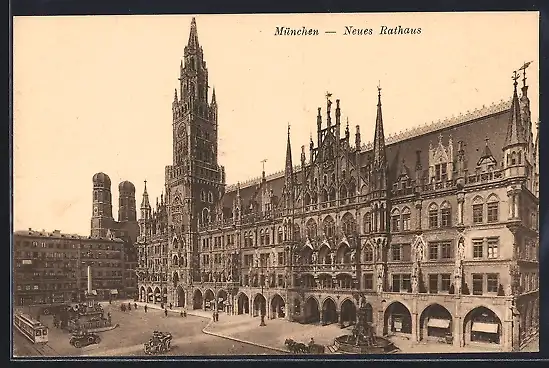 AK München, Rathaus mit Brunnen, Strassenbahn
