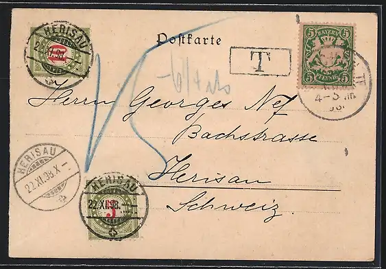 Personenbezogene Daten auf der Rückseite der Karte wurden durch blauen Textmarker unkenntlich gemacht. Die blauen Stellen sind auf die Vorderseite durchgeweicht und wirken sich negativ auf das Postkartenfoto aus