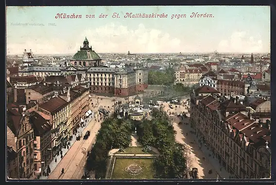 AK München, Sonnenstrasse von der St. Matthäuskirche aus, Strassenbahn