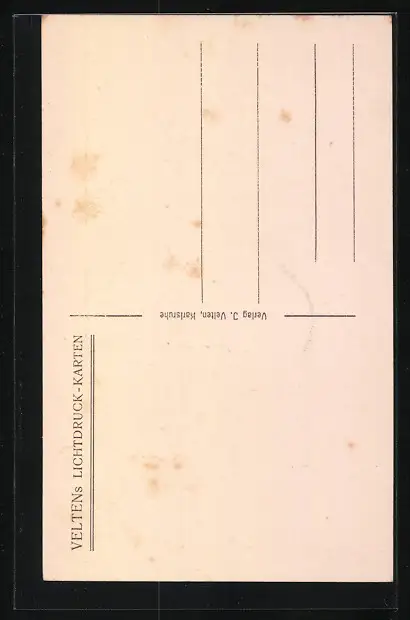 Personenbezogene Daten auf der Rückseite der Karte wurden durch blauen Textmarker unkenntlich gemacht. Die blauen Stellen sind auf die Vorderseite durchgeweicht und wirken sich negativ auf das Postkartenfoto aus