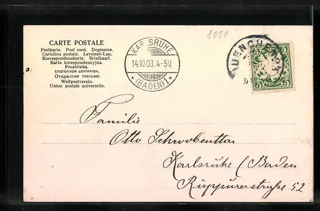 Personenbezogene Daten auf der Rückseite der Karte wurden durch blauen Textmarker unkenntlich gemacht. Die blauen Stellen sind auf die Vorderseite durchgeweicht und wirken sich negativ auf das Postkartenfoto aus