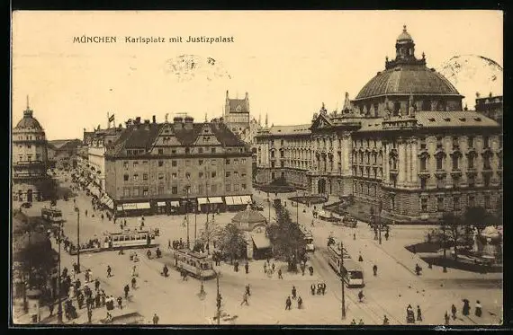 AK München, Strassenbahn am Karlsplatz mit Justizpalast