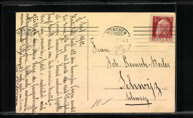 Personenbezogene Daten auf der Rückseite der Karte wurden durch blauen Textmarker unkenntlich gemacht. Die blauen Stellen sind auf die Vorderseite durchgeweicht und wirken sich negativ auf das Postkartenfoto aus