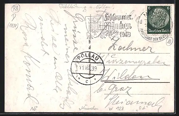 gelaufen 1939, Eckknicke re. oben, guter Zustand