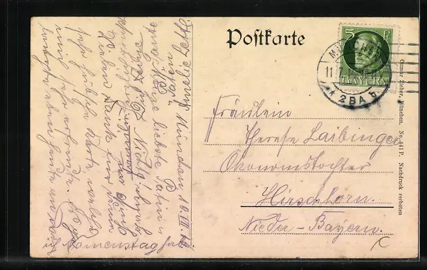 Personenbezogene Daten auf der Rückseite der Karte wurden durch blauen Textmarker unkenntlich gemacht. Die blauen Stellen sind auf die Vorderseite durchgeweicht und wirken sich negativ auf das Postkartenfoto aus