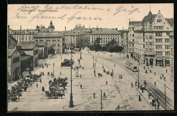 AK München, Strassenbahn auf dem Bahnhofsplatz