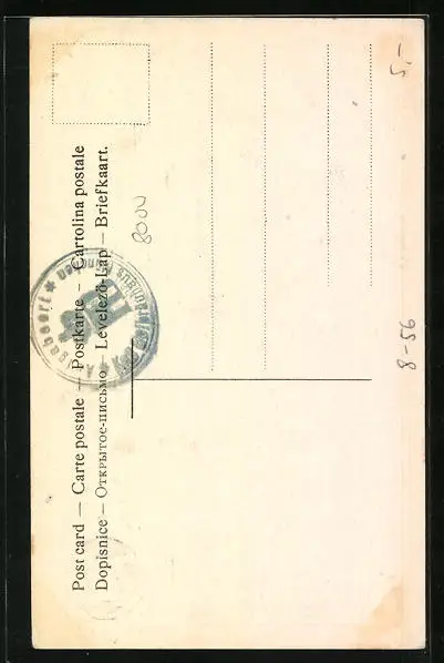 Personenbezogene Daten auf der Rückseite der Karte wurden durch blauen Textmarker unkenntlich gemacht. Die blauen Stellen sind auf die Vorderseite durchgeweicht und wirken sich negativ auf das Postkartenfoto aus