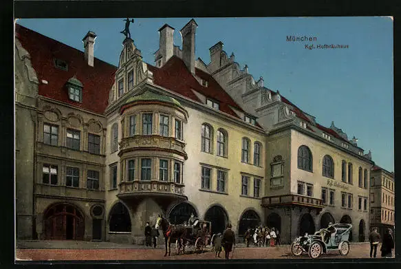 AK München, Strassenpartie mit Hofbräuhaus, Kutsche und Automobil