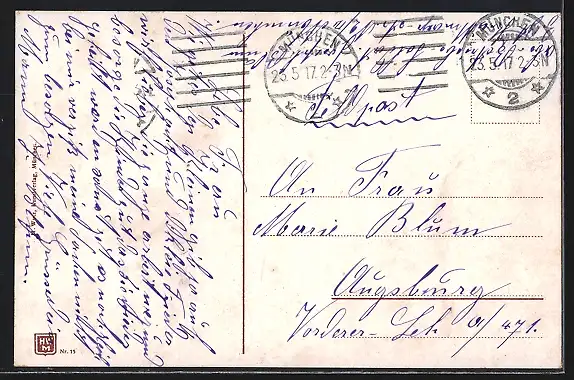 gelaufen 1917, vorderseitig Klebe- und Papierreste, Abriebspur re. oben, guter Zustand