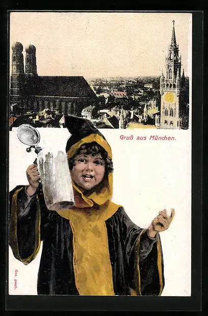 AK München, Teilansicht m. Dom, Münchner Kindl m. Krug