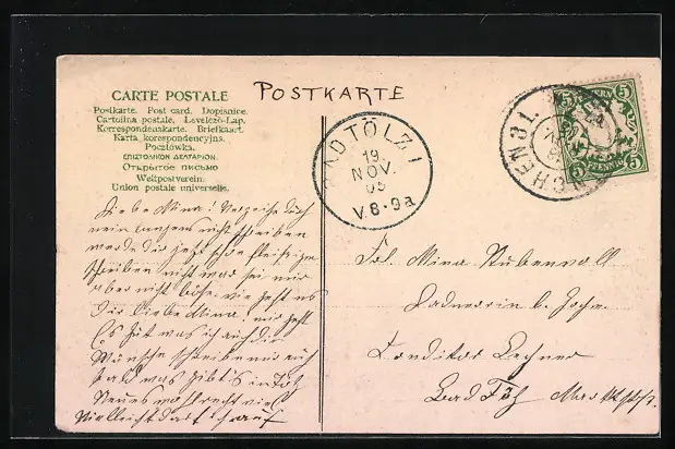 alte Ansichtskarte, gelaufen 1905, kl. Eckschaden unten re., Stempelspur, guter Zustand