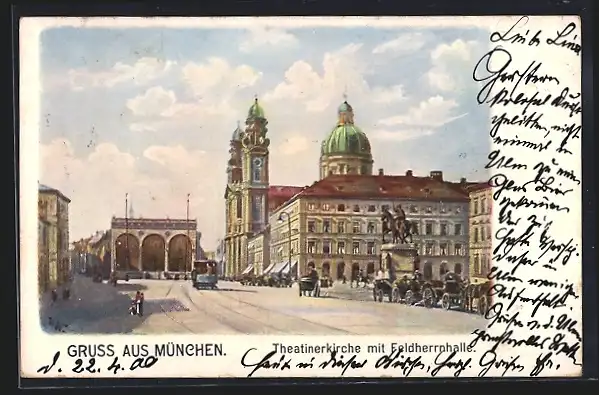 AK München, Theatinerkirche und Feldherrenhalle, Strassenbahn