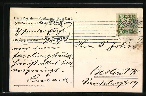 Personenbezogene Daten auf der Rückseite der Karte wurden durch blauen Textmarker unkenntlich gemacht. Die blauen Stellen sind auf die Vorderseite durchgeweicht und wirken sich negativ auf das Postkartenfoto aus