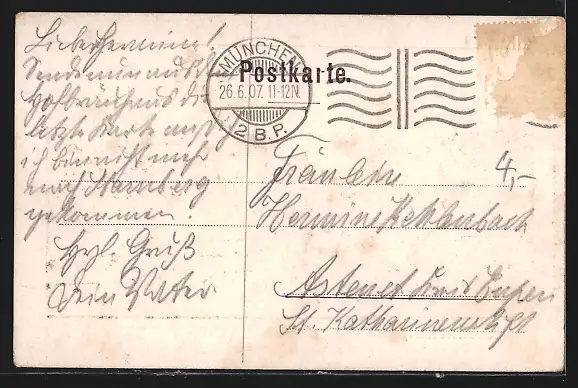 alte Ansichtskarte, gelaufen 1907, Briefmarke entfernt, rückseitig Oberflächenschaden, Stempelspur, guter Zustand