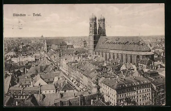 AK München, Totalansicht mit Frauenkirche aus der Vogelschau