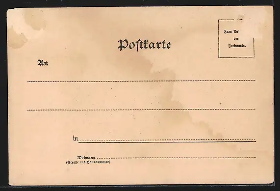 Personenbezogene Daten auf der Rückseite der Karte wurden durch blauen Textmarker unkenntlich gemacht. Die blauen Stellen sind auf die Vorderseite durchgeweicht und wirken sich negativ auf das Postkartenfoto aus
