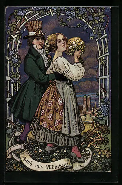 AK München, Verliebtes Paar beim Spaziergang, Münchener Typen