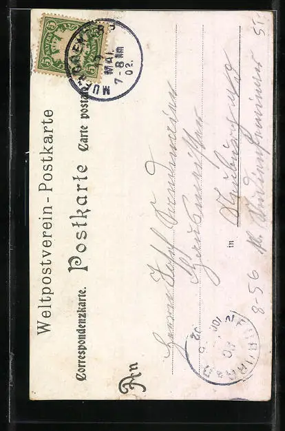 Personenbezogene Daten auf der Rückseite der Karte wurden durch blauen Textmarker unkenntlich gemacht. Die blauen Stellen sind auf die Vorderseite durchgeweicht und wirken sich negativ auf das Postkartenfoto aus