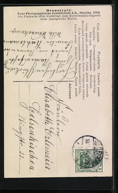 Personenbezogene Daten auf der Rückseite der Karte wurden durch blauen Textmarker unkenntlich gemacht. Die blauen Stellen sind auf die Vorderseite durchgeweicht und wirken sich negativ auf das Postkartenfoto aus