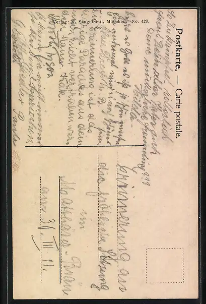 Personenbezogene Daten auf der Rückseite der Karte wurden durch blauen Textmarker unkenntlich gemacht. Die blauen Stellen sind auf die Vorderseite durchgeweicht und wirken sich negativ auf das Postkartenfoto aus
