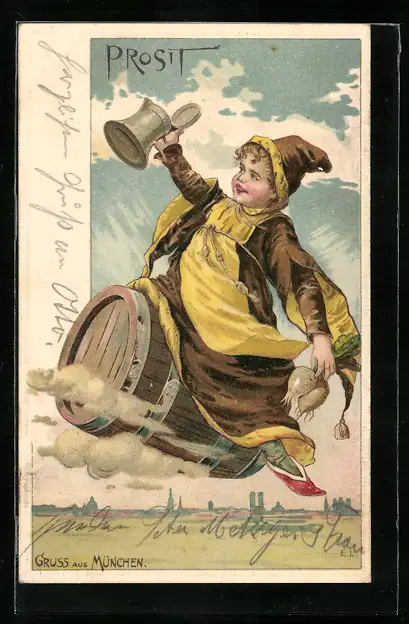 AK Münchner Kindl mit Bierkrug fliegt auf einem Bierfass