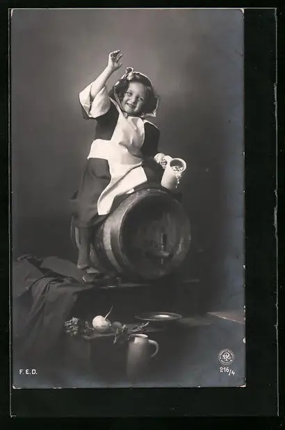 AK Münchner Kindl mit Bierkrug sitzt auf Fass