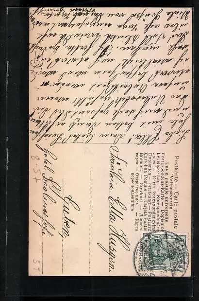 Personenbezogene Daten auf der Rückseite der Karte wurden durch blauen Textmarker unkenntlich gemacht. Die blauen Stellen sind auf die Vorderseite durchgeweicht und wirken sich negativ auf das Postkartenfoto aus