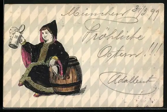 AK Münchner Kindl mit Bierkrug und Bierfass