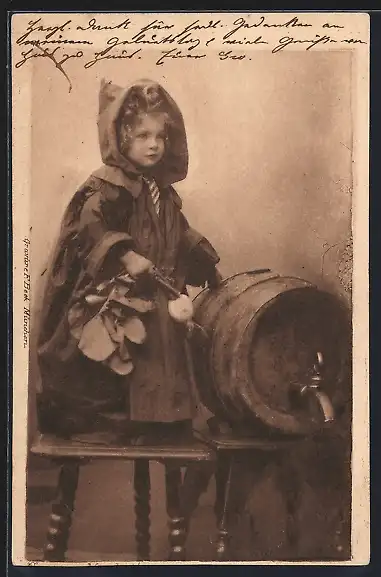 AK Münchner Kindl mit Radi an einem Bierfass