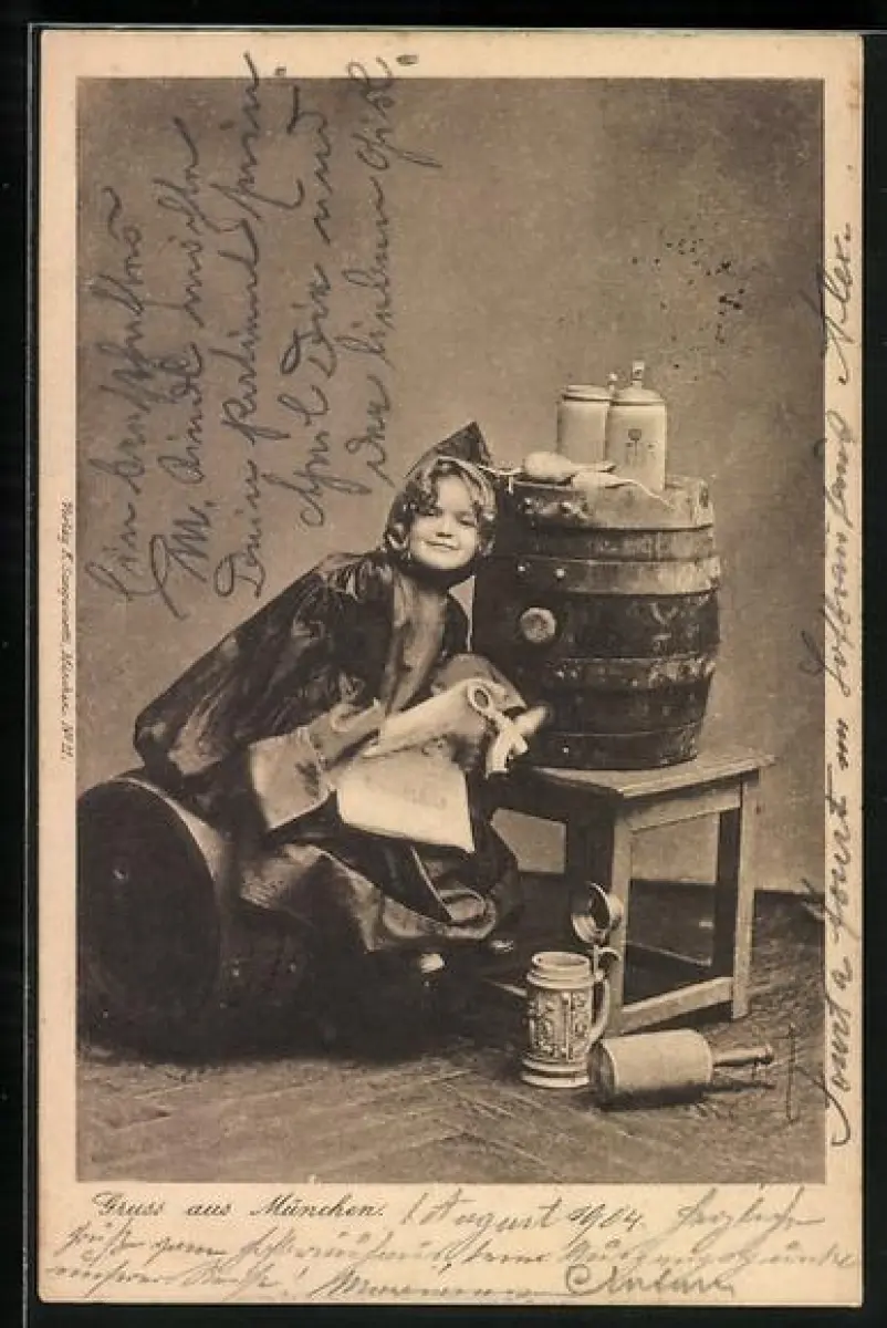AK Münchner Kindl sitzt auf Bierfass