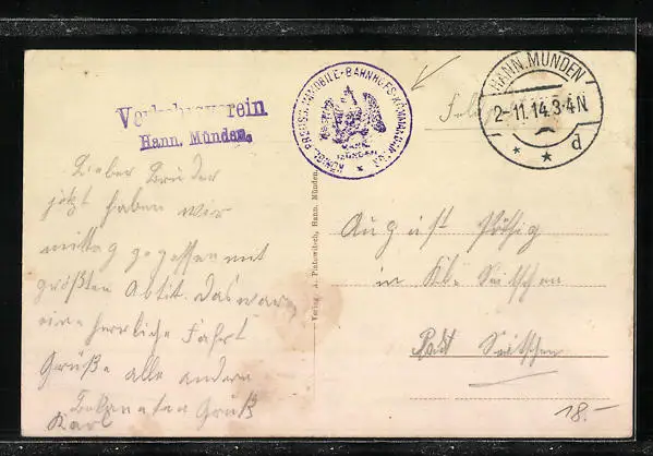 gelaufen 1914 als Feldpost, Eckknick li. oben, Bugspur li. oben, guter Zustand
