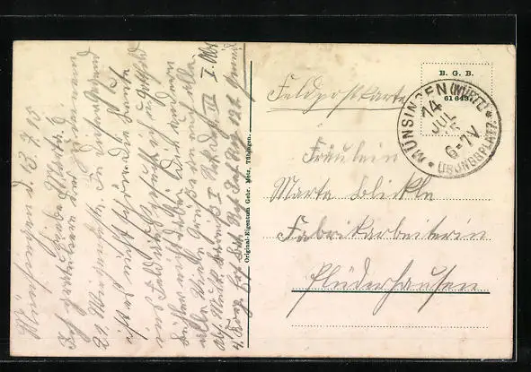 Personenbezogene Daten auf der Rückseite der Karte wurden durch blauen Textmarker unkenntlich gemacht. Die blauen Stellen sind auf die Vorderseite durchgeweicht und wirken sich negativ auf das Postkartenfoto aus