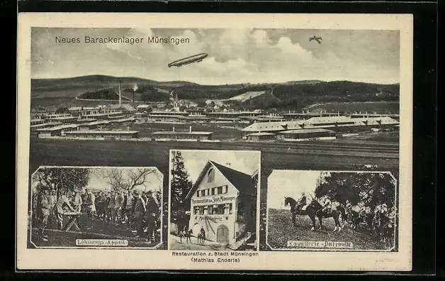 AK Münsingen, Neues Barackenlager, Zeppelin, Restauration z. Stadt Münsingen v. Mathias Enderle