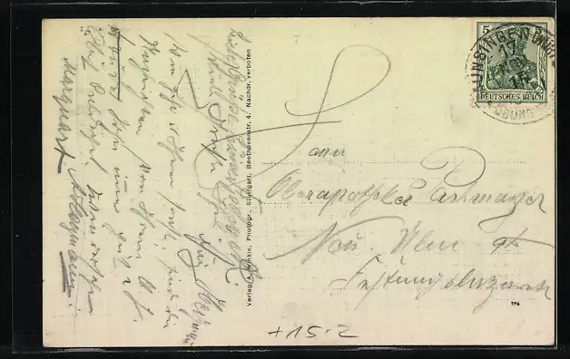 Personenbezogene Daten auf der Rückseite der Karte wurden durch blauen Textmarker unkenntlich gemacht. Die blauen Stellen sind auf die Vorderseite durchgeweicht und wirken sich negativ auf das Postkartenfoto aus
