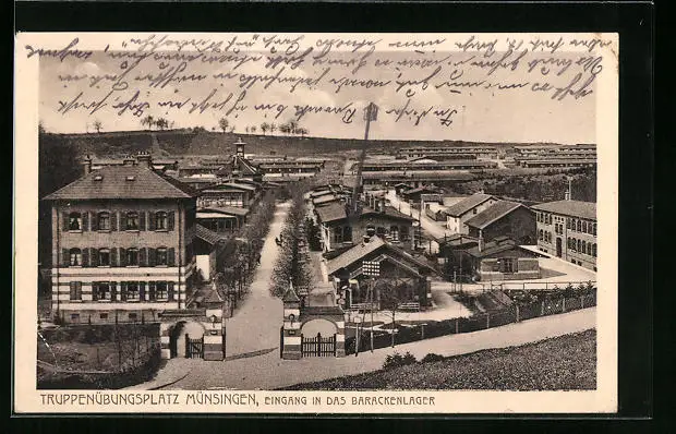 AK Münsingen, Truppenübungsplatz, Eingang in das Barackenlager