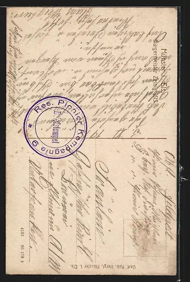 Personenbezogene Daten auf der Rückseite der Karte wurden durch blauen Textmarker unkenntlich gemacht. Die blauen Stellen sind auf die Vorderseite durchgeweicht und wirken sich negativ auf das Postkartenfoto aus