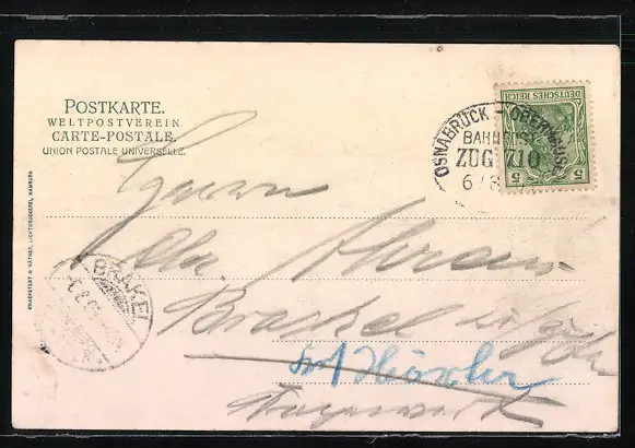 Personenbezogene Daten auf der Rückseite der Karte wurden durch blauen Textmarker unkenntlich gemacht. Die blauen Stellen sind auf die Vorderseite durchgeweicht und wirken sich negativ auf das Postkartenfoto aus
