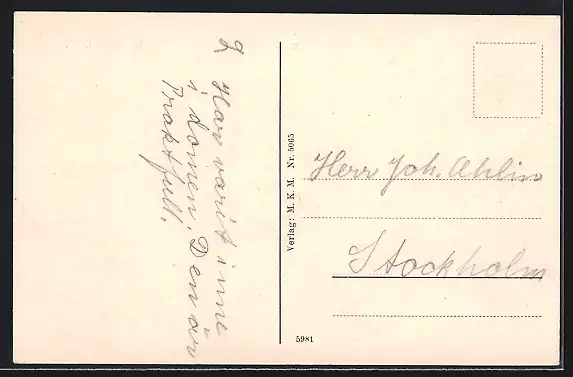 Personenbezogene Daten auf der Rückseite der Karte wurden durch blauen Textmarker unkenntlich gemacht. Die blauen Stellen sind auf die Vorderseite durchgeweicht und wirken sich negativ auf das Postkartenfoto aus