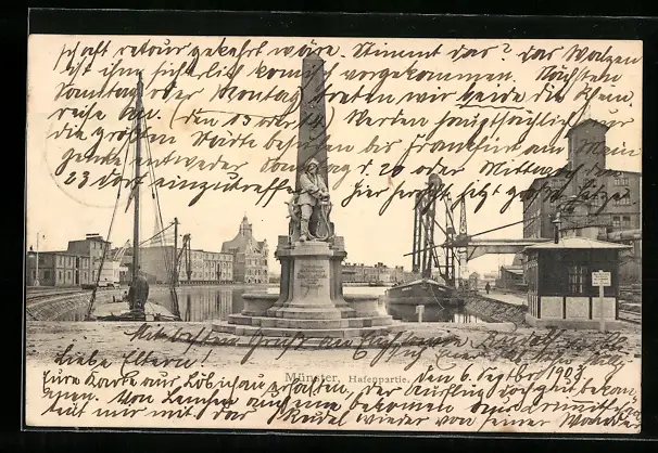 AK Münster i. W., Hafenpartie mit Denkmal