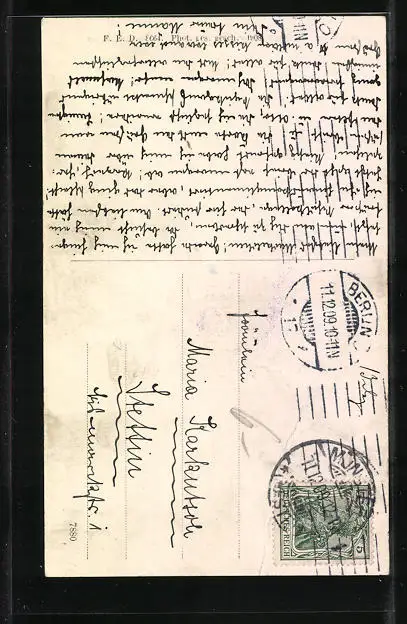 Personenbezogene Daten auf der Rückseite der Karte wurden durch blauen Textmarker unkenntlich gemacht. Die blauen Stellen sind auf die Vorderseite durchgeweicht und wirken sich negativ auf das Postkartenfoto aus