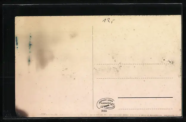 Personenbezogene Daten auf der Rückseite der Karte wurden durch blauen Textmarker unkenntlich gemacht. Die blauen Stellen sind auf die Vorderseite durchgeweicht und wirken sich negativ auf das Postkartenfoto aus