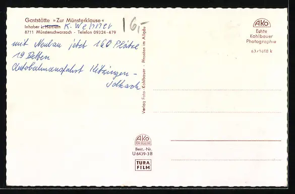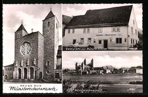 AK Münsterschwarzach, Ortsansicht, Abtei, Gaststätte zur Münsterklause, Inh. K. Wehner