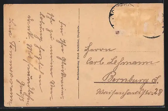 alte Ansichtskarte, gelaufen, Briefmarke entfernt, Eckknicke unten, guter Zustand
