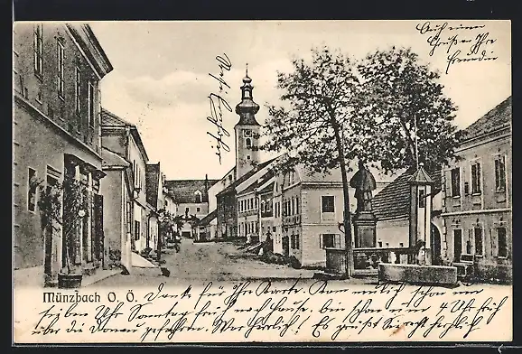 AK Münzbach /O. Ö., Strassenpartie mit Denkmal und Kirche