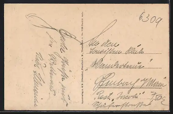 Personenbezogene Daten auf der Rückseite der Karte wurden durch blauen Textmarker unkenntlich gemacht. Die blauen Stellen sind auf die Vorderseite durchgeweicht und wirken sich negativ auf das Postkartenfoto aus